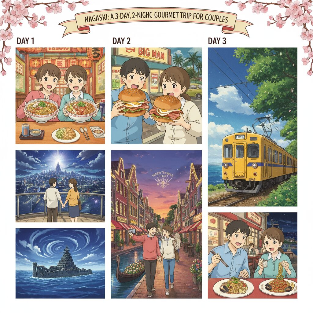この日は鉄道のゆったり移動を活かし、絶景と軽めのグルメで余韻を残す。全体として、名物グルメの多様性(ちゃんぽん、バーガー、イタリアン)と絶景(夜景、廃墟、自然)のバランスが夫婦旅行の満足度を高め、無理のないペースで長崎の魅力を凝縮します。
